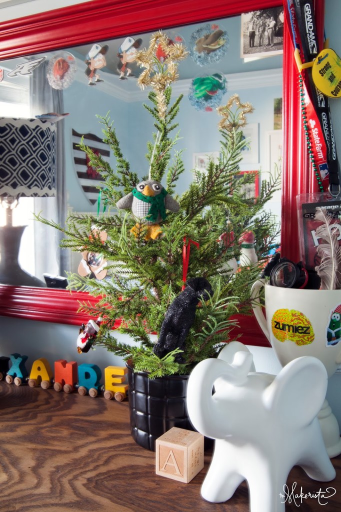 I took a small tree I already had, placed it in a pot on Xander’s dresser, and decorated it with ornaments he has received as gifts. He really enjoys pointing out the loved one who gave him a specific ornament.