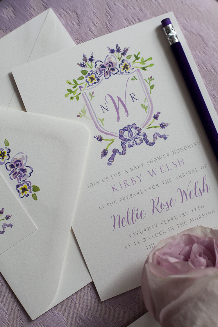 In the search for the perfect invites, many of you recommended Dixie Design to me on Instagram. The minute I saw the African Violet invitation I knew it was the one purple is Kirby’s favorite color. I love the monogram and the sweet little watercolor details. Plus, you can get thank you cards for the mom-to-be and any extra gift tags will be fun for Kirby to use with that beautiful monogram.