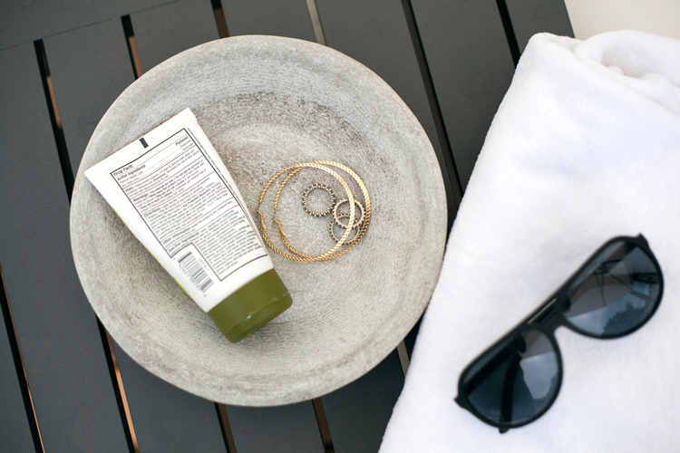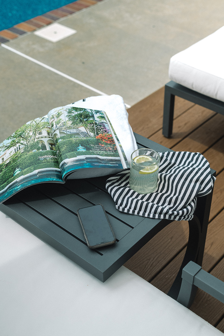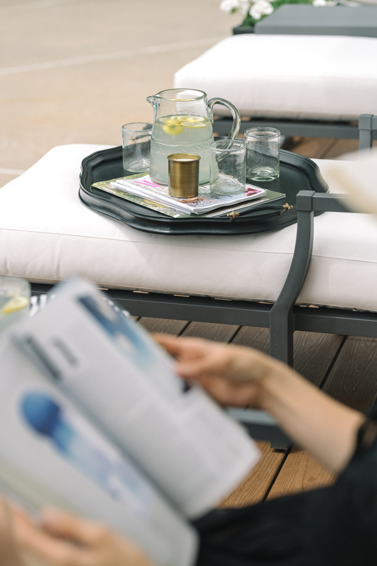 A PLACE TO REST YOUR STUFF: If you’re wanting to create an inviting space outside you have to consider the same issues as inside. Your guests want somewhere to put their drink, a place to lay reading material, and somewhere to contain their jewelry and smaller items. Side tables are perfect for this, and a c table is so great for a lounger because you can pull your things right up next to you. Little bowls or baskets on tabletops are the ideal drop spot to corral jewelry and sunglasses.