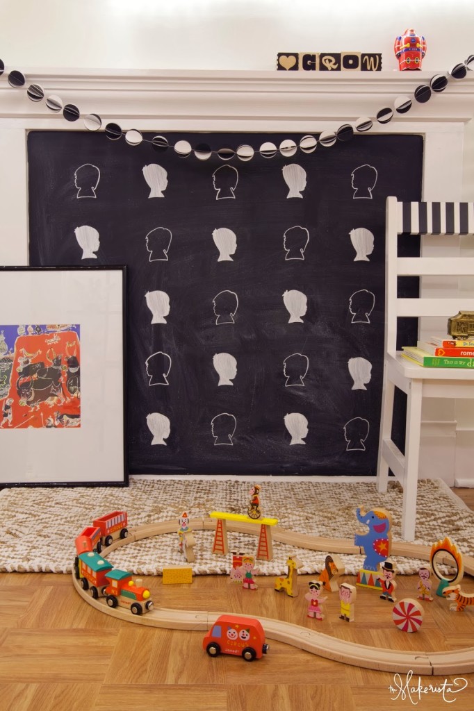 I took some old profile shots I had of the kids, printed and cut them out and then just traced them evenly spaced out with pencil. I’ve always been the type to measure and take forever to lay something like this out, but since it’s not permanent and it’s a kids space, I felt like winging it was fine (and freeing). Then I went over it with the marker and decided to color in Xander’s silhouettes for some contrast. I made the garland for Xander’s 3rd birthday party.