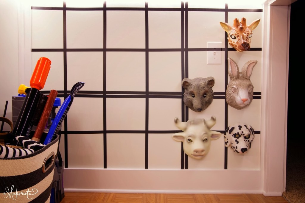 Again, I eyeballed this and it’s not perfect but I think kids spaces don’t have to be. The masks were left over from Xander’s 4th birthday party and I hung them up using some Command hooks.