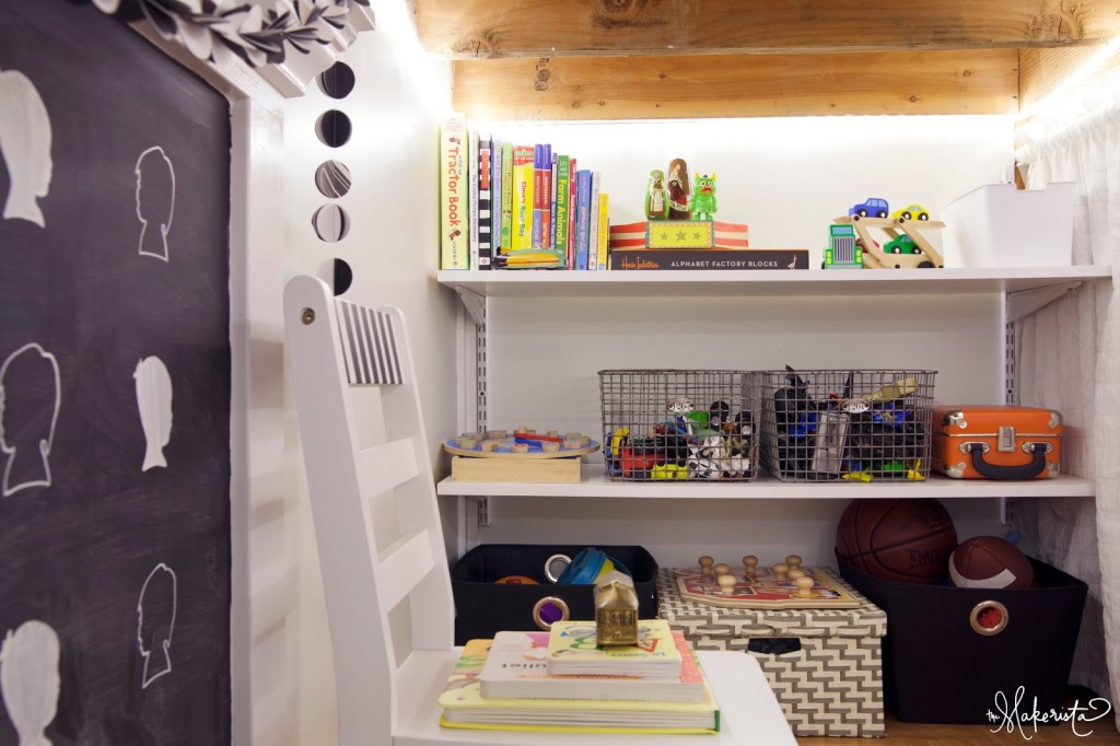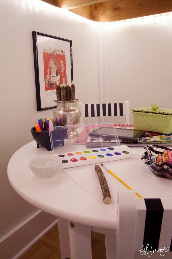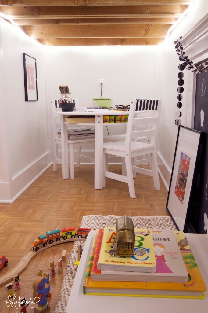 What a darling little space you created for your children! They must love it. I love the lighting you put in there and your chalkboard and art! Great job!