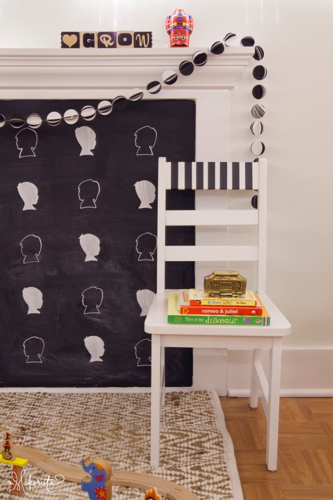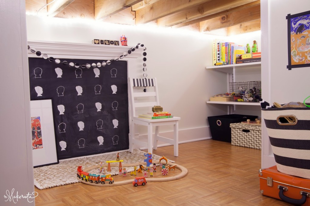 absolutely phenomenal! the chalkboard silhouette project is my favorite but also the ephemeral nature of it (once your kids get a crack at it) is really appealing to me as well – it's not meant to be forever and that what makes it so special right now. plus i also tip my hat for creating all that awesomeness while you must have been scooting around under those 4' ceilings on your knees or bottom painting and installing shelves and such. bravo!