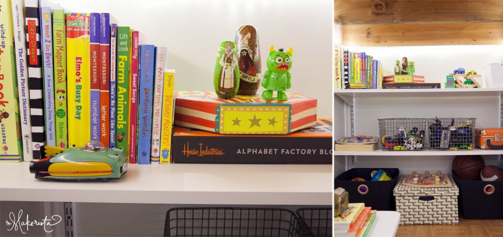 It took us a little longer than we had hoped, but we are finished with the kid’s new space, and I thought I’d show you what it looks like before it doesn’t look so orderly anymore. (It’s only a matter of hours before Xander works on his spelling all over my chalk art, and Milly takes every single thing off of the shelves and out of the baskets, while coloring on anything a crayon will write on.)