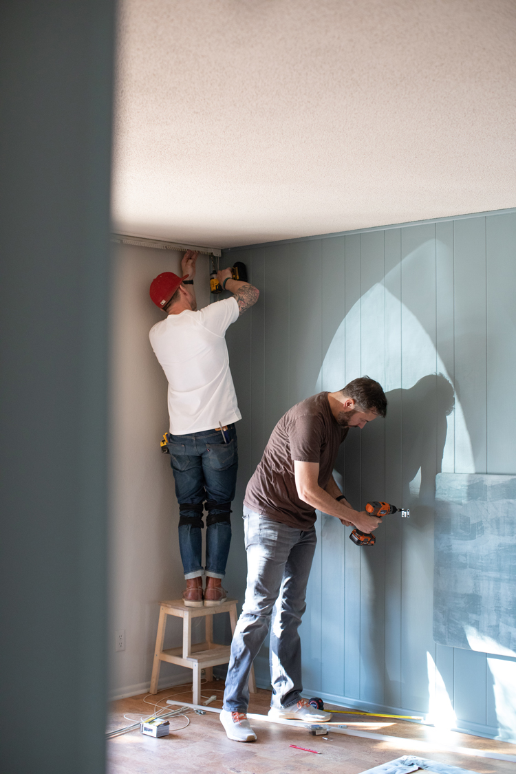 Julia and I both had the idea to do an upholstered headboard, and the curtains were the perfect fabric for that DIY. We cut three rectangles with rounded edges out of mdf and stapled batting around them, then the curtain fabric. Julia and I started this project but Jenny Komenda showed up and finished it for us! It was such a joy to meet her in person, and her upholstery skills are unmatched. We ended up washing the nightstands in the wall color for a softer look, and they really pop off of the headboard. And how about those pendants? They’re perfect for this mid century bedroom. Would you believe we didn’t even have to wire them? We used the puck light trick I used in the laundry room to give them light without the need to run electrical, and the result is beautiful and functional. Another DIY you can see in my Instagram stories here.