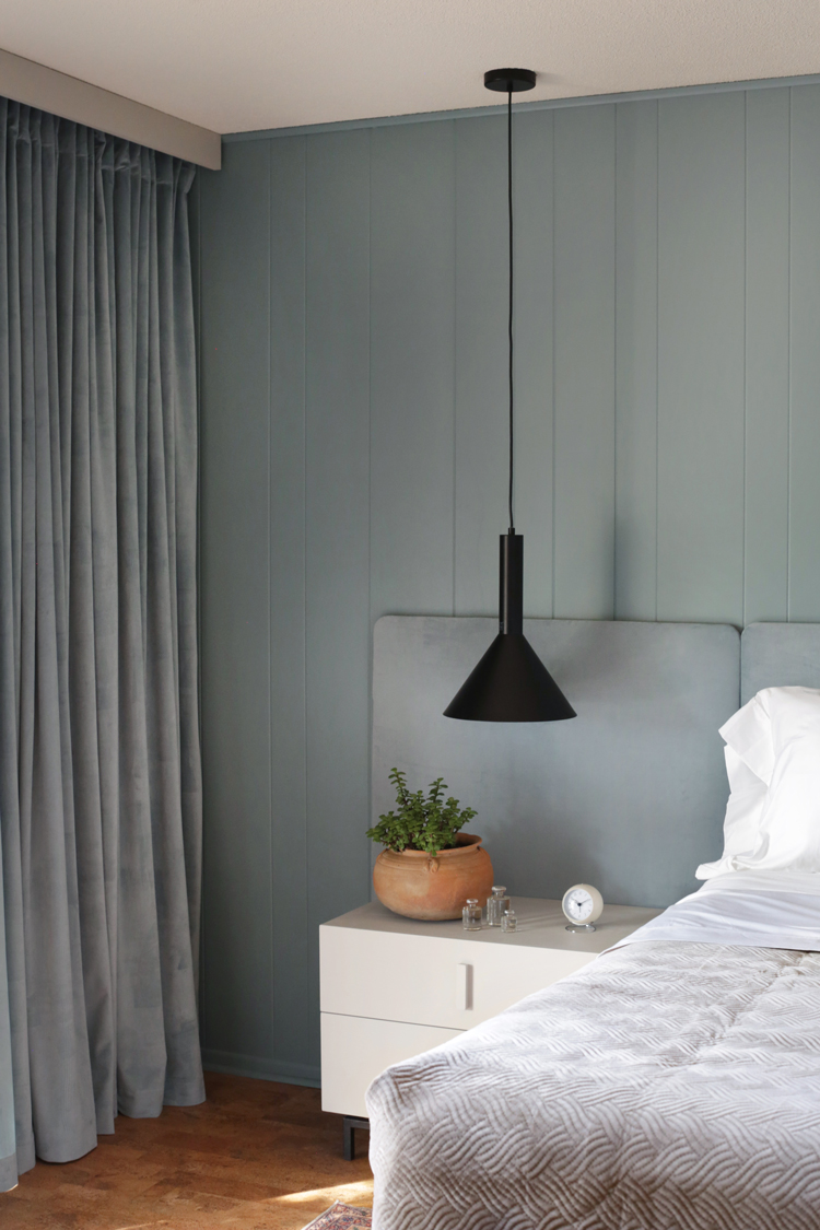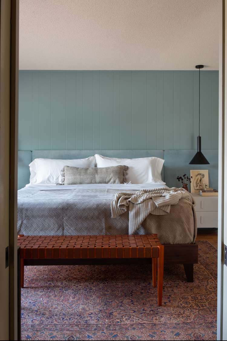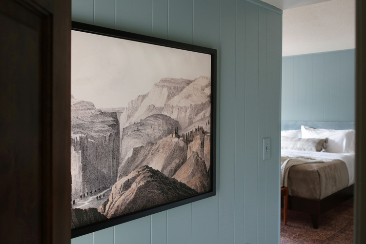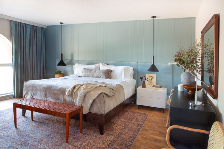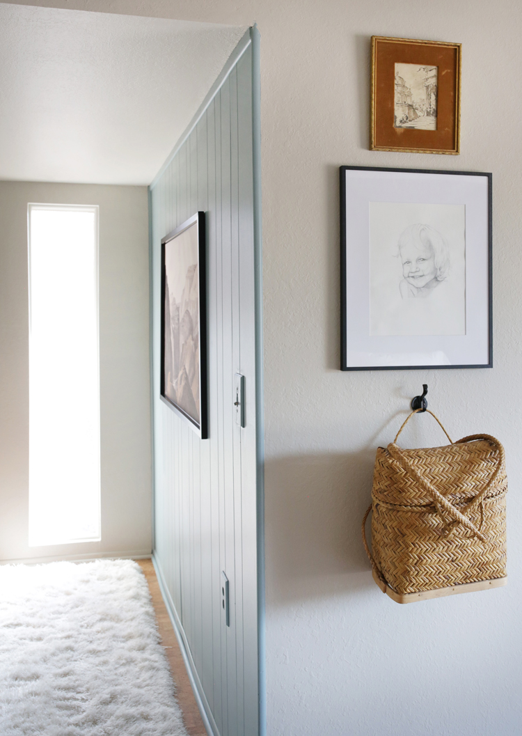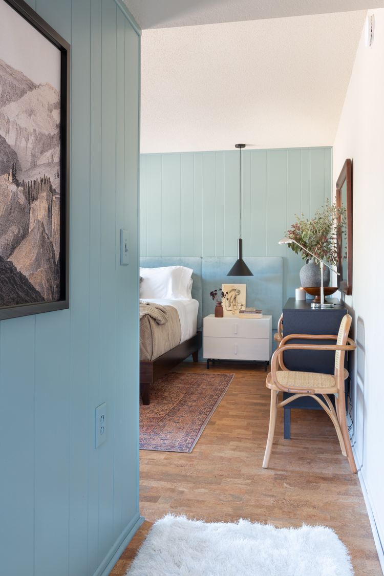 Sometimes the things I love to do feel like fluff, like they don’t necessarily matter in the big picture. But giving this family a place that can be a sanctuary for them, a place of rest and calm, a breath of fresh air in this home they bought for their son but never got a chance to bring him home to – that’s where I see design’s greatest purpose. Let’s dive into the design and details. As I mentioned in my mood board post, keeping with the homes integrity was a big thing on our list. Cori isn’t afraid of color but wanted the room to feel light. We took the more neutral walls on Julia’s board and mixed them with the blue/green paneling from mine, inspired by the landscape. Accent walls can be a tricky thing, but these are original to the home and an element of mid century design, so they feel very appropriate.