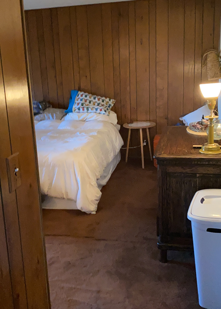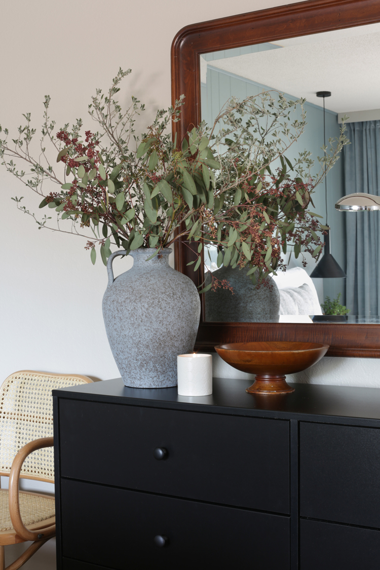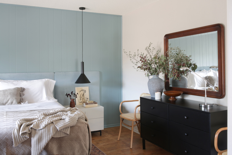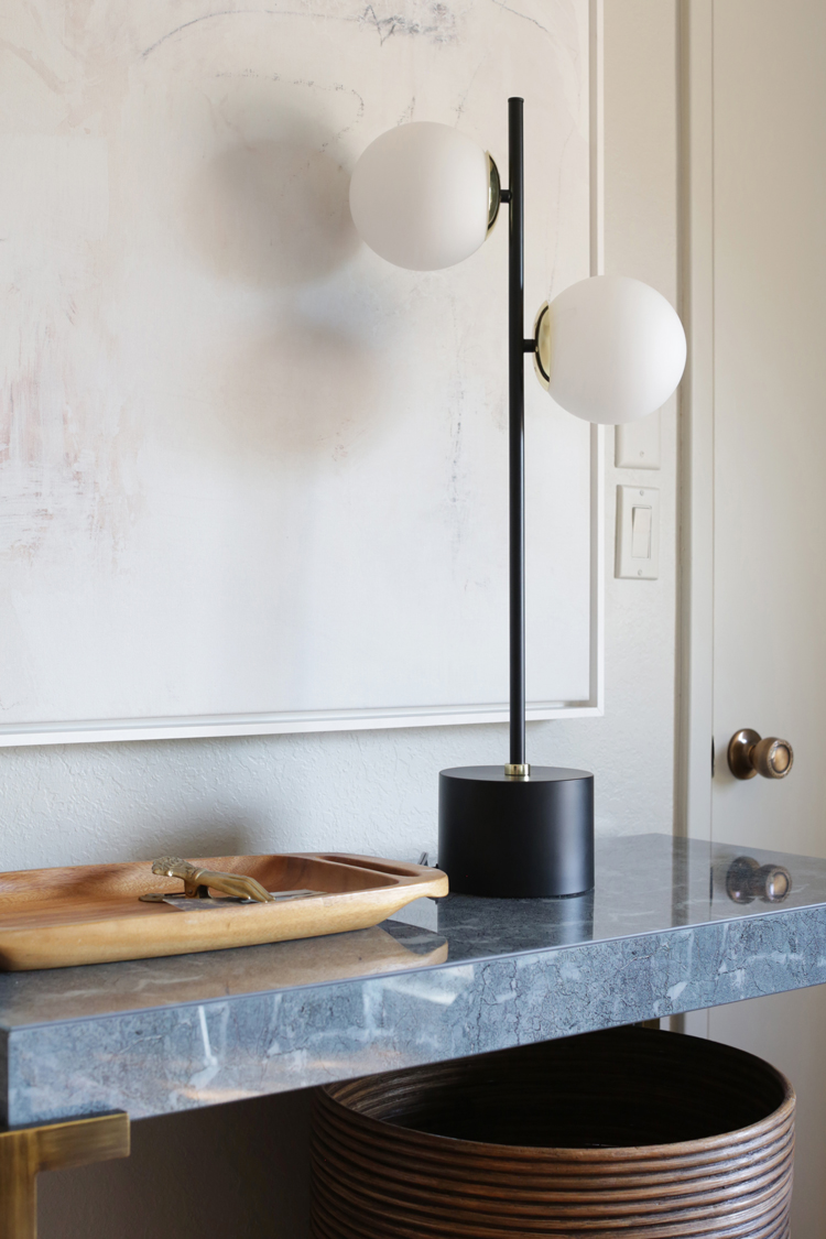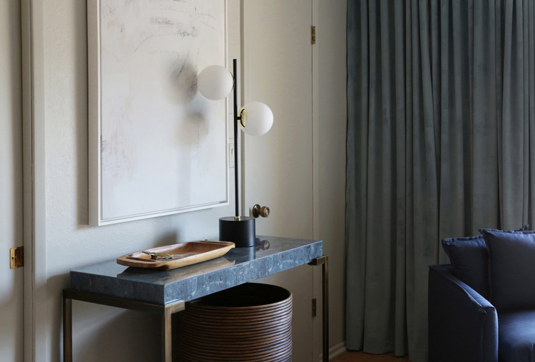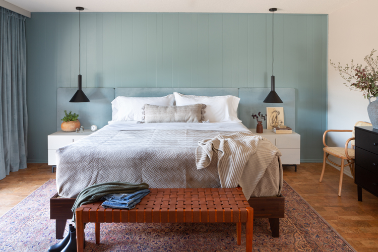 Sometimes the things I love to do feel like fluff, like they don’t necessarily matter in the big picture. But giving this family a place that can be a sanctuary for them, a place of rest and calm, a breath of fresh air in this home they bought for their son but never got a chance to bring him home to – that’s where I see design’s greatest purpose. Let’s dive into the design and details. As I mentioned in my mood board post, keeping with the homes integrity was a big thing on our list. Cori isn’t afraid of color but wanted the room to feel light. We took the more neutral walls on Julia’s board and mixed them with the blue/green paneling from mine, inspired by the landscape. Accent walls can be a tricky thing, but these are original to the home and an element of mid century design, so they feel very appropriate.