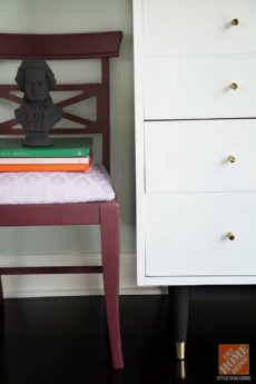 I don’t do “girly” a lot, but I think the tone on tone of pinks with the chair and walls against the modern lamp and sculptural side table is really relaxing. I love a burl frame and this texture print by my friend, Laura, (enter code “makerista” at checkout for free shipping!) is just enough to add interest. I can never resist a pop of poppy that name is rather appropriate for that color, isn’t it? and Aldi roses for 3.99 aren’t easy to pass up.