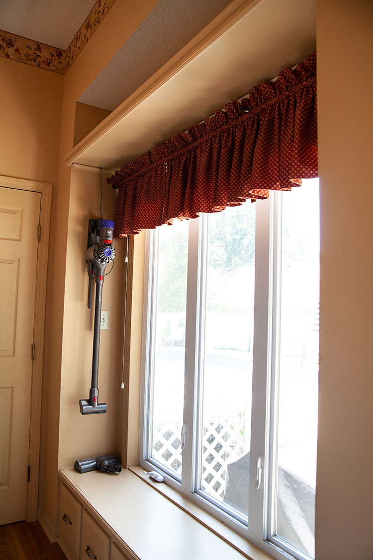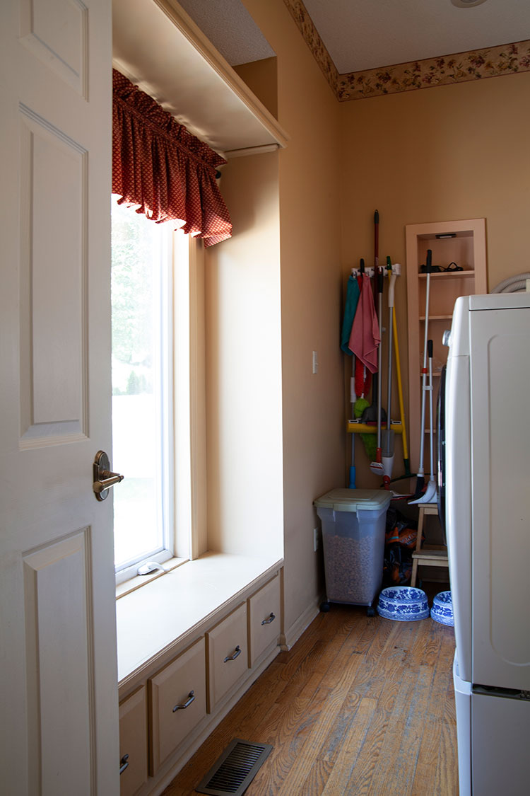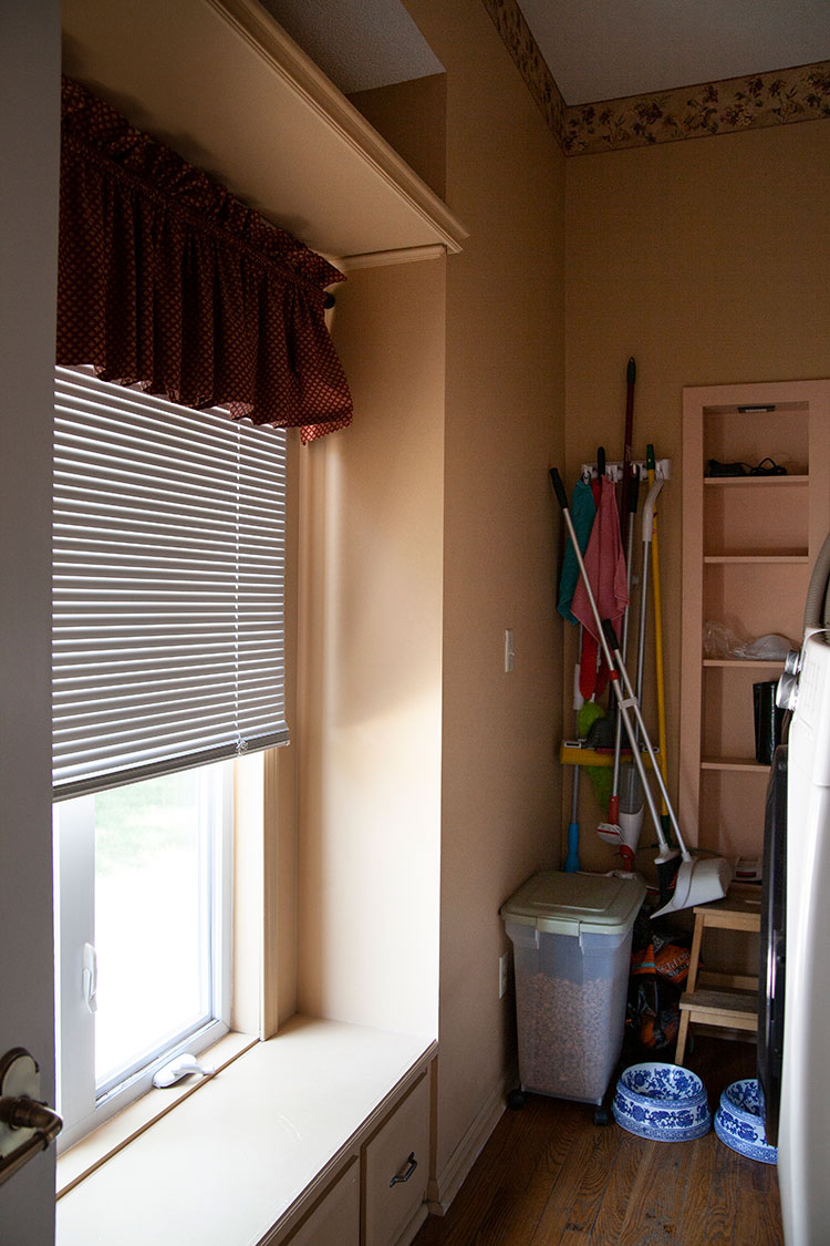 This 10×5′ space has had to play more than just a laundry room. Our home was built in the 80’s, so there is no mudroom. No space to coral “stuff.” It not only has to clean clothes, it needs to feed the dog, act as a butler’s pantry, and contain the pool towels and cleaning supplies. This needs to be much more than a laundry room. Right now there isn’t a whole lot that is super functional. The washer and dryer stick out further than the cabinets, making a narrow space even tighter. As Hank has grown, it has become even more tricky to squeeze him to the back of the room for dinner or a drink. While there is some cabinet storage that I have been grateful for, there could be so much more. And at 5’8″ I have trouble reaching anything in those upper cabinets hence the bottles on the tops of the machines. Aesthetically speaking, it’s not a room I love to be in. The walls are beige but lean towards orange. The big window could let in a lot of light, but is covered by dated treatments. The cat door was certainly functional for someone else, but we don’t have a feline friend, and at 95 pounds Hank couldn’t even fit his head through it if he wanted to.