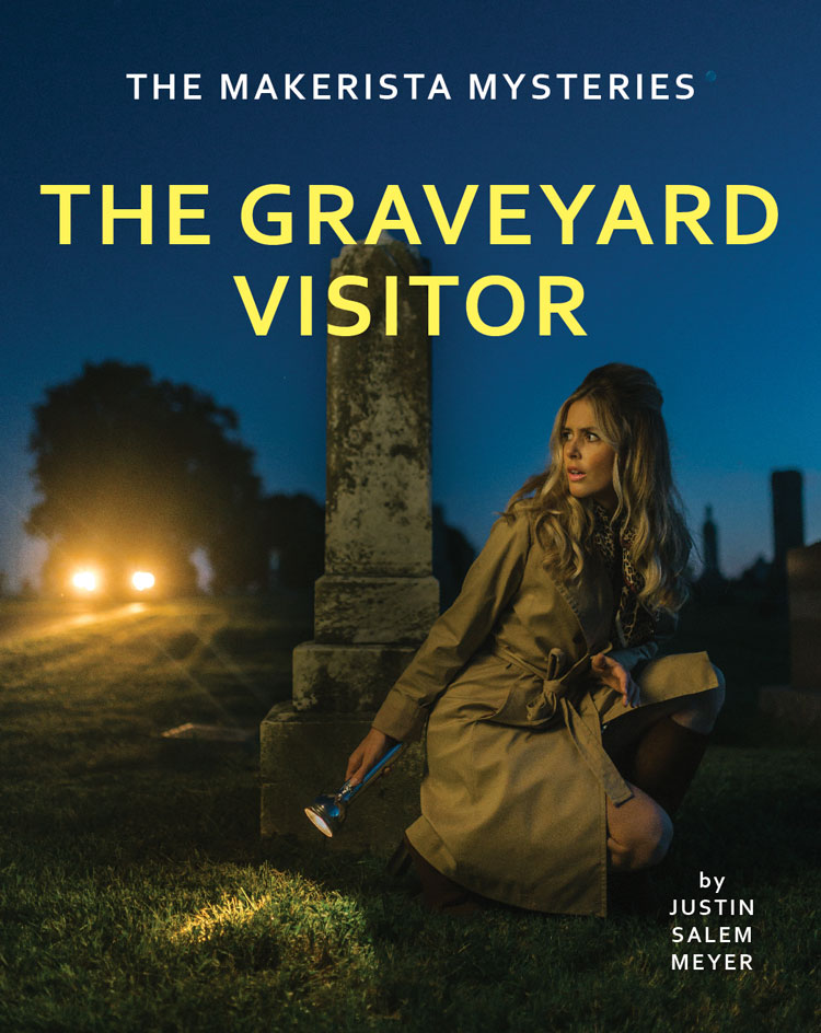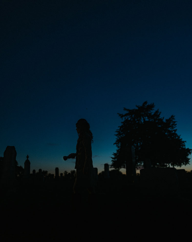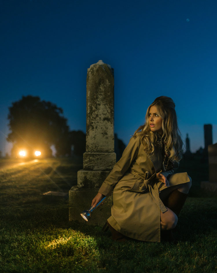 For a passion project like this, timing is kind of what’s available. We chatted about the concept here and there when we had a moment in the weeks leading up to the shoot. We had goals to get three covers with some supporting shots, but the graveyard cover was the shot we saw in our head the most. If we nailed that, the rest was icing on the cake. We don’t shoot in this manor really. It’s more about shooting me in my house during the day, so it was stepping outside our norm and being open to what magic would happen. Justin arrived at 6pm from Des Moines as I was finishing up hair and makeup. We were out the door and headed to the local graveyard by 7:15 where we met Steve with the Chevelle. We wrapped those two stories by 8:15 and were on our way back to my house. I changed outfits and we shot the library story, half the time with Domino running into shots, ha.