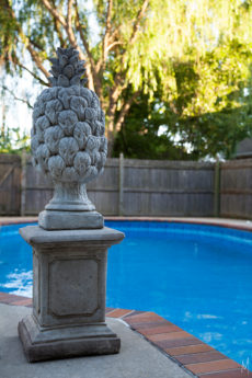 Under the back windows sits the gardening table, stocked with lots of plants that are ready to move outside once the fear of frost is gone. Gardening has become such a big part of my warmer seasons, and I love plotting and planning my current beds texture and color and dreaming of more landscape to plant. The upholstered screen is perfect for pinning ideas to, and can also provide some relief from the hot, setting sun for some of the potted plants. The slim console next to the door gave us a great opportunity to show off some of my bags and hats.