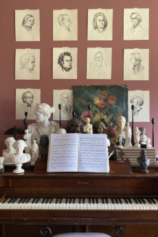 art of The Tower of London | child’s portrait | ceramic, dachshund paper holder | decorative brass, floral plate | greek key vase
