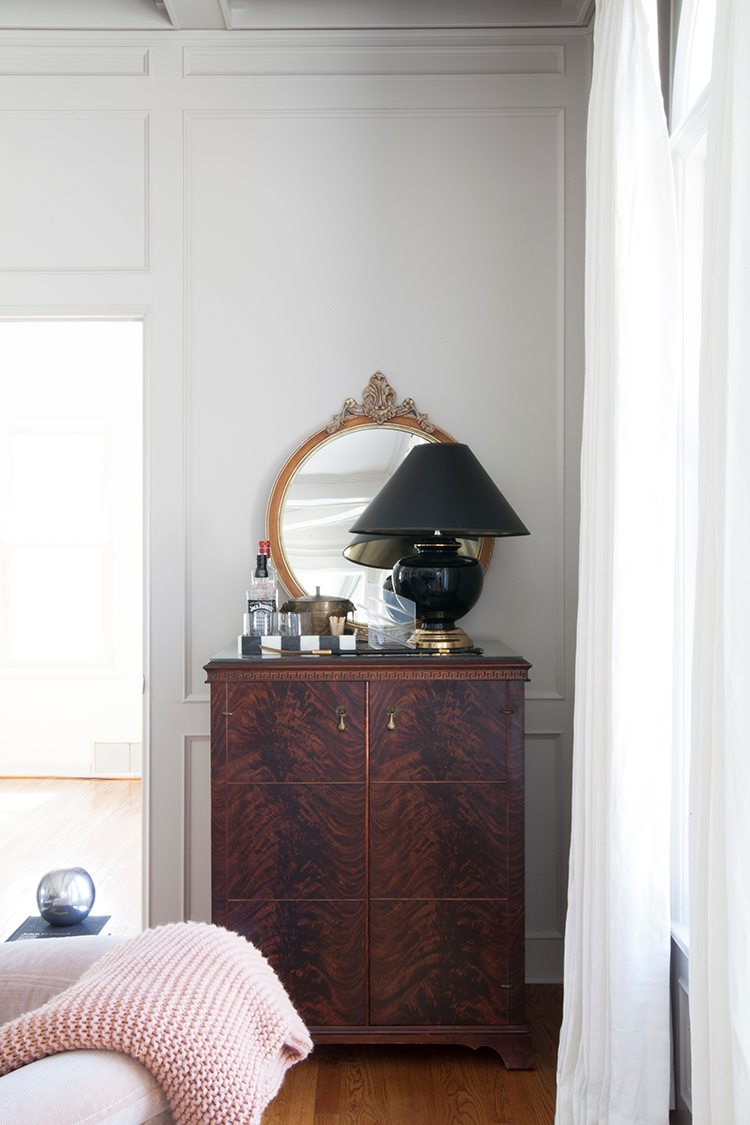 This cabinet is one of the best things I’ve ever found on Facebook Marketplace. If you’re not shopping there, you really should be! The older couple I bought it from was using it as a TV cabinet, but I’m keeping some barware and decor items in it at the moment. The wood grain is just stunning, the greek key feels so expensive, and the little brass knobs are adorable. I’m still searching for the perfect mirror for above it if you only knew how many mirrors I’ve looked at and trying to be patient and not settle for something that’s close. For now this French beauty I got at a garage sale will do.