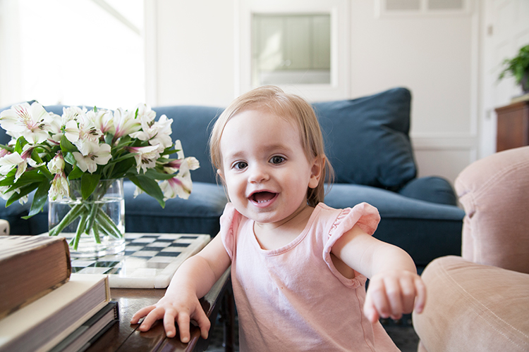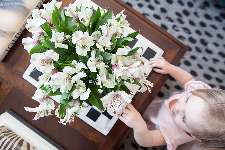 I have one more big switch that is going to really help with the visual design of the room. We also need art and more lamps to really come to life, but for now some grocery store flowers and a cute little girl will have to do.